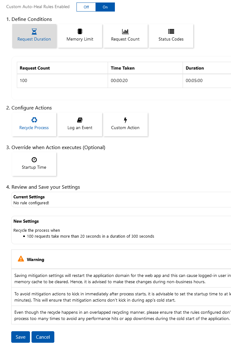 Your scenarios will likely differ a lot, depending on the applications you are operating. Here I am configuring this web app to recycle whenever there are slow requests piling up. If there are 100 slow requests (taking 20s or more) in the last 300 seconds, I will recycle the app service automatically.