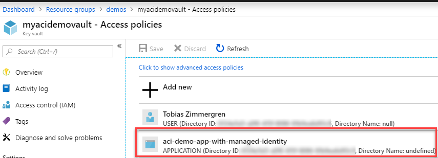 To grant permissions for this new identity to other resources, for example our Key Vault that I’ve created in my “demos” resource group, we need to define the policy for it: