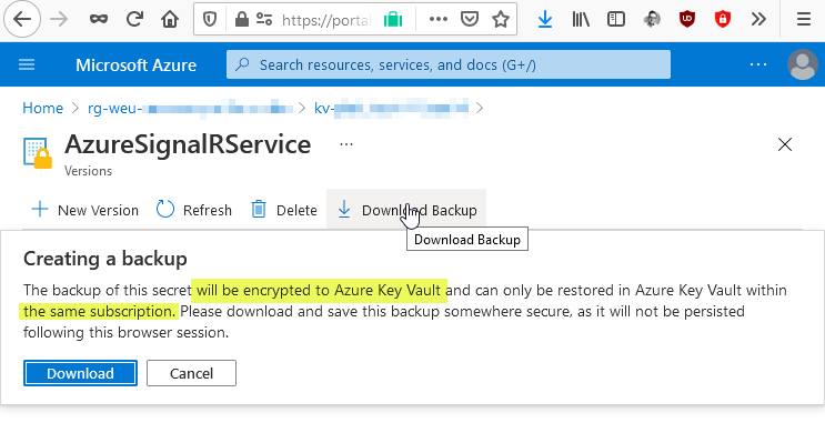 The easy option is to backup objects directly from the Azure Portal. However, as mentioned in the introduction above, this will encrypt your secrets and you can only restore them into the same subscription.
