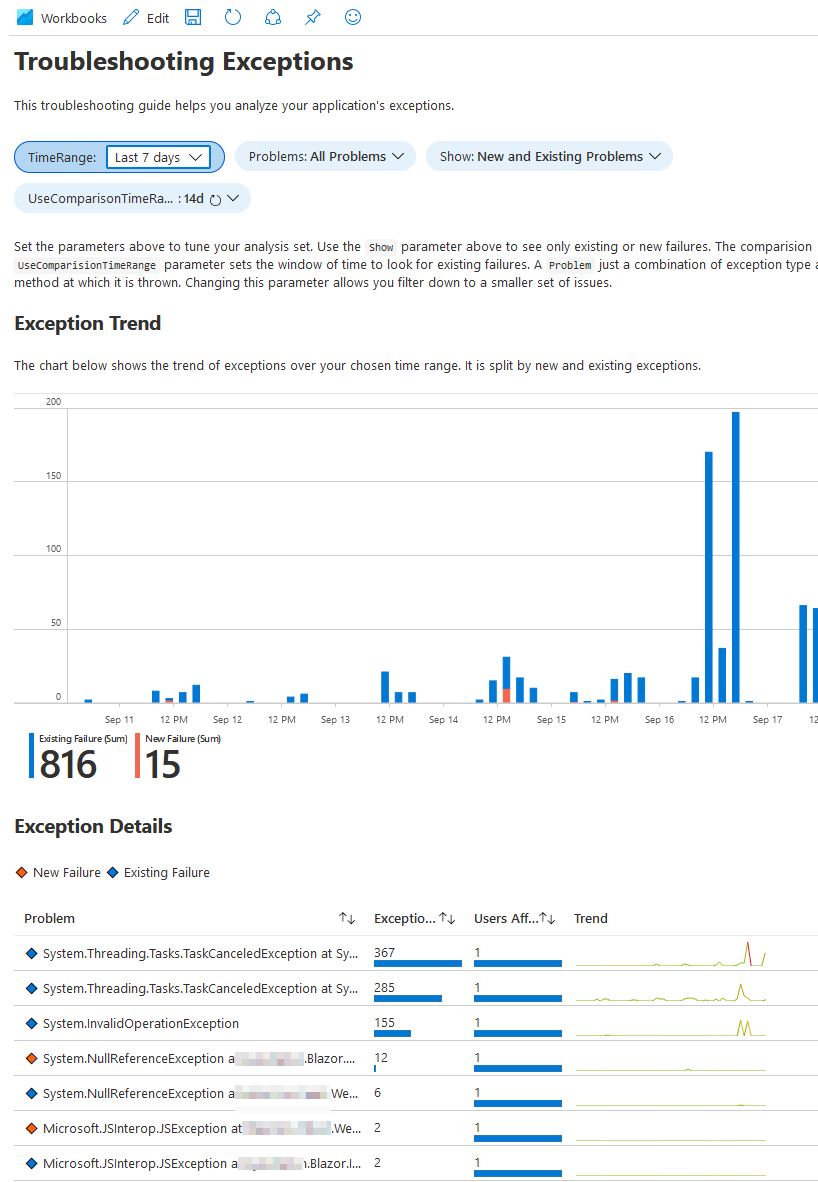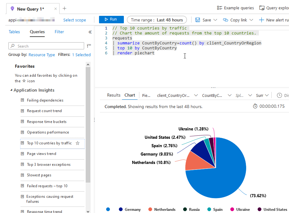 The built-in queries that we get with Application Insights are amazing, too. We can start using any of them, and drill-down and filter as we see fit.