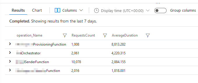 Here’s how I query a specific function app and a specific function. I know this one is slow sometimes, and I want to see how often we have issues.