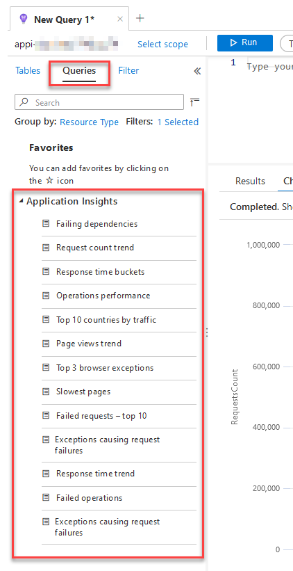 Head over to your Application Insights, click “Queries” and choose from the list of pre-defined popular queries.