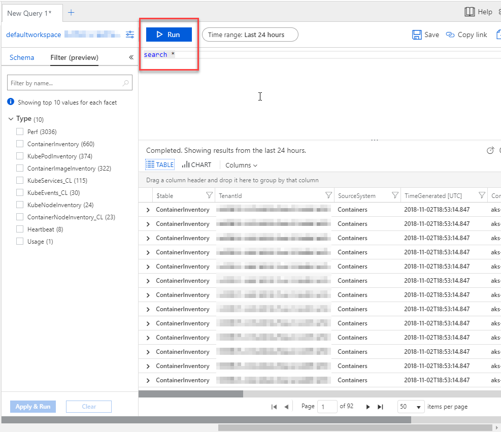After only a couple of minutes, I can see that the logs are streaming in and that Log Analytics is getting populated with data from my AKS cluster.