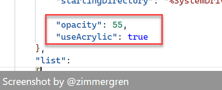 I am configuring the opacity/transparency in Windows Terminal.