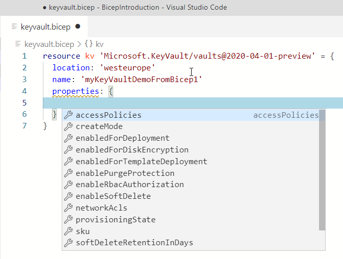 We already installed the Bicep extension for Visual Studio Code, so now we can make use of the sweet intellisense that it provides.