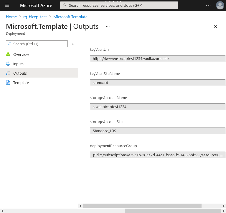 - Read more about outputs in the language definition: Bicep Outputs