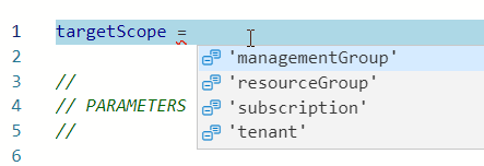 We get lots of help from IntelliSense if we author our files with the extension for Visual Studio Code, and we can see the available scopes when we start to define the targetScope: