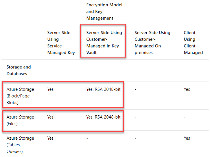 TableorQueueservices. Azure Storage Account have support for customer-managed encryption-at-rest for the File, Block/Page Blobs types only.