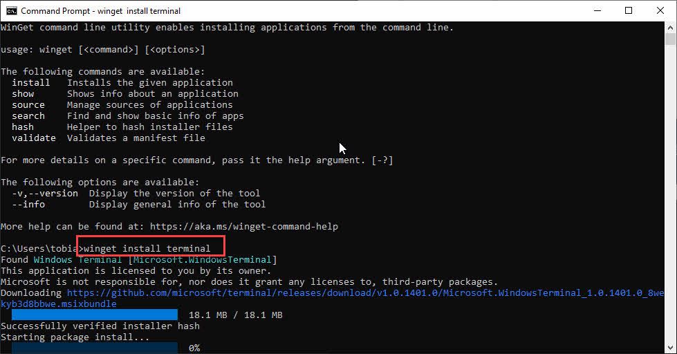 winget install terminal - installs the Windows Terminal on your system using the Windows Package Manager