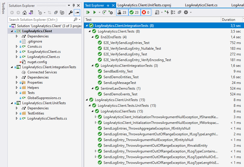 You should have a pleasant and neat project set up. I’ve already built a few unit tests and a set of integration tests. These tests help verify that the code works with the latest version of Log Analytics running in the cloud.