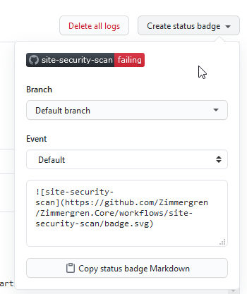 Because visual indicators are important, I also want to create a fancy badge that I can add to my repository landing page. You can select “Create status badge”: