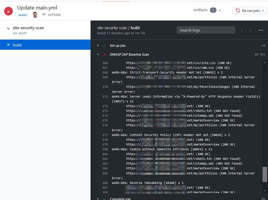 A failing security check, using GitHub Actions and OWASP Baseline Scan.