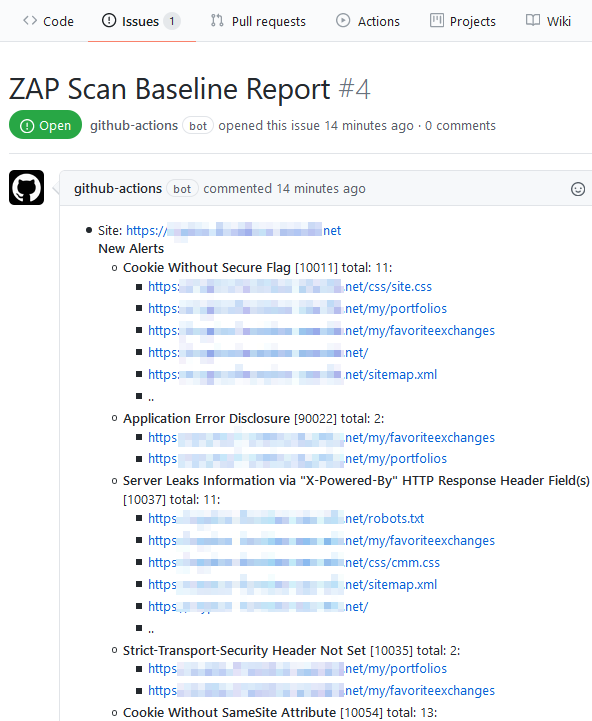 OWASP ZAP scanner have created an issue in the GitHub Issues list, after a successful processing with GitHub Actions OWASP security scanner.