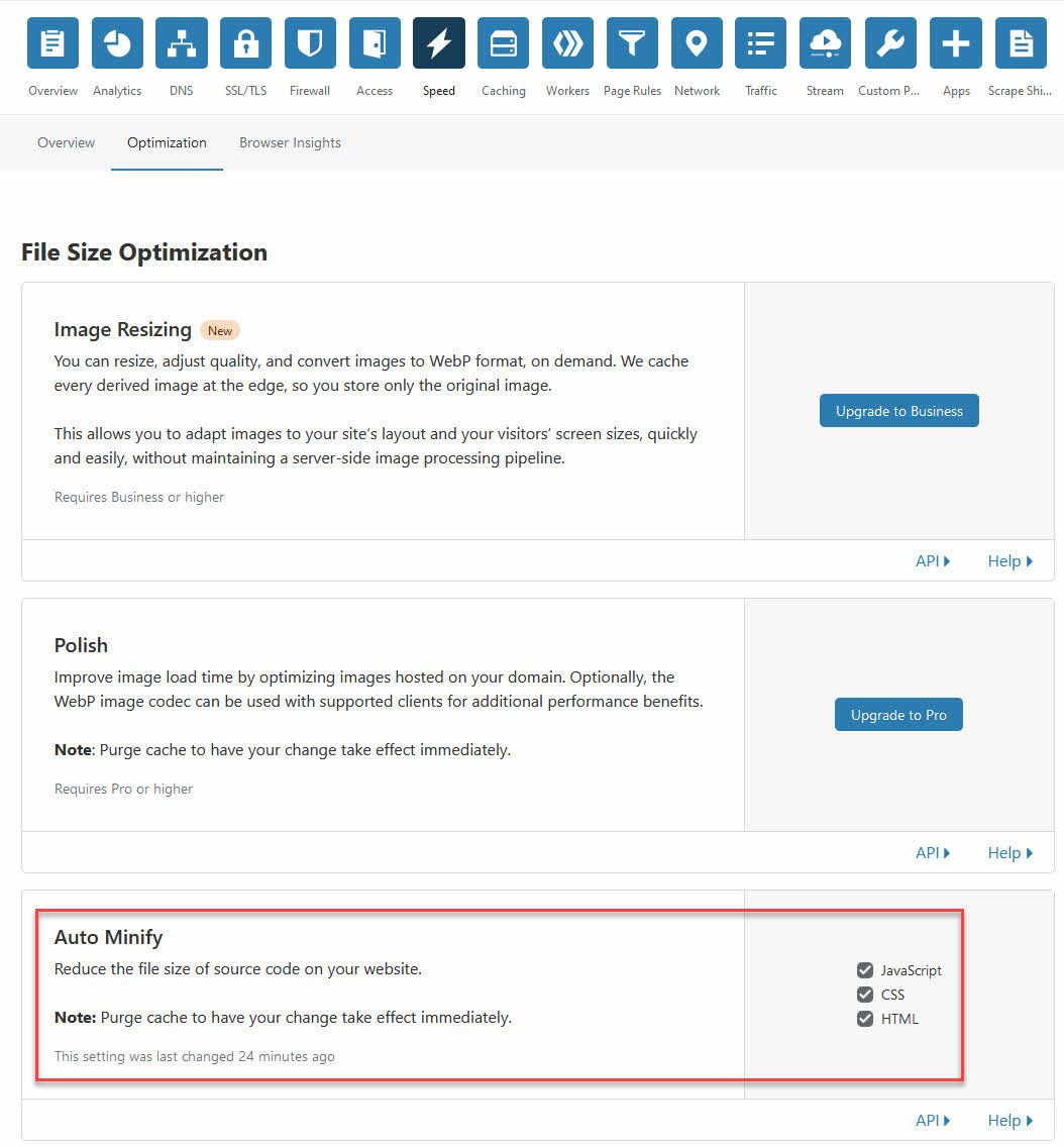 Cloudflare optimizations for page speed. Auto minify JavaScript, CSS and HTML.