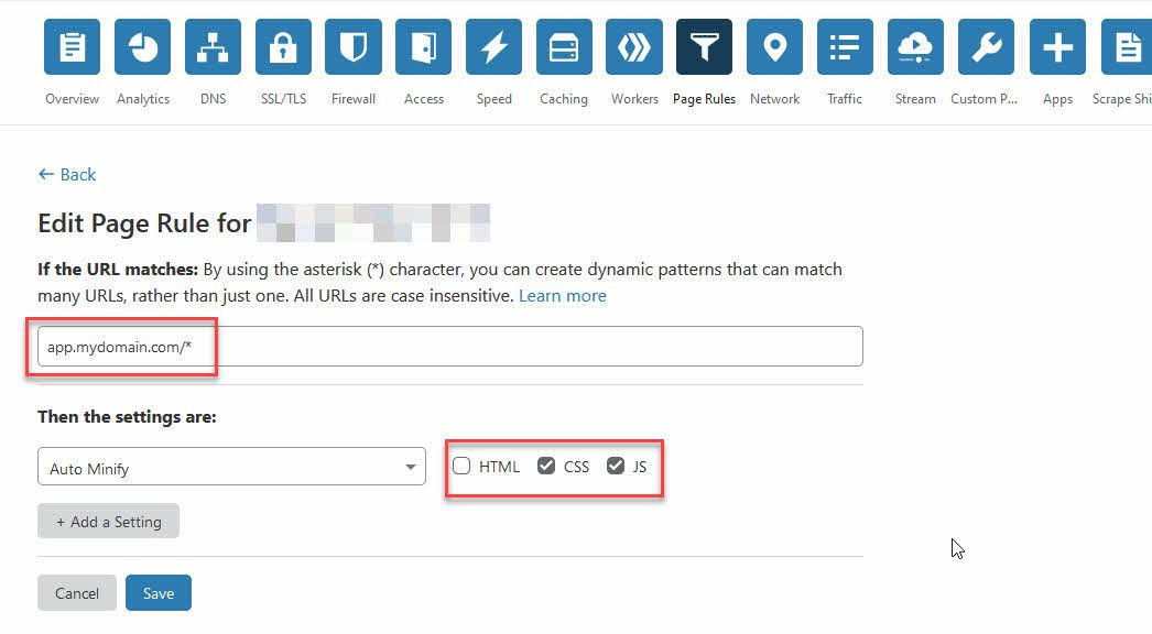 Heading over to Page Rules, I can define a new rule, saying that my subdomain “app.mydomain.com” should NOT minify HTML. I have left CSS, and JS enabled in order to boost performance as much as I can with that content.