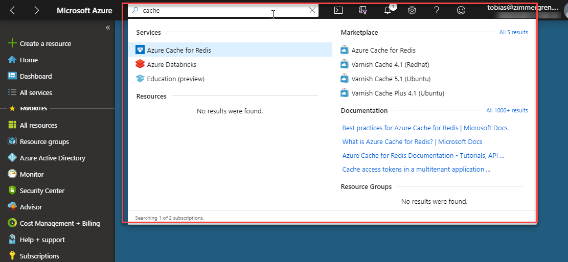 Azure Portal Desktop Application, using the Search bar
