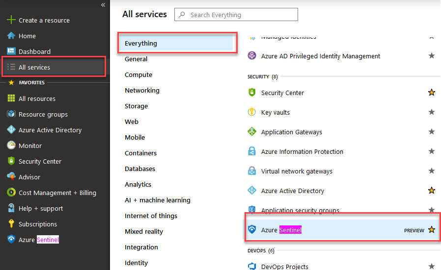 In my subscriptions I’ve found that either using the Search box, or just going the traditional route like this works well “All Services - Azure Sentinel” - I also starred it so it’ll appear in my left navigation: