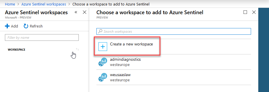 Once you’ve clicked on Azure Sentinel, you can go ahead and create a new LAW (Log Analytics Workspace). Sentinel does not work with default workspaces from Azure Security Center, which is why they’re not listed here.
