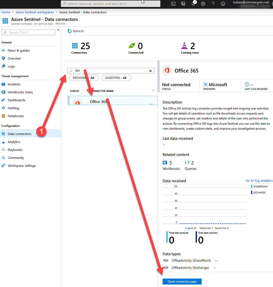 - Office 365 Data Connector for Azure Sentinel (Microsoft Docs)