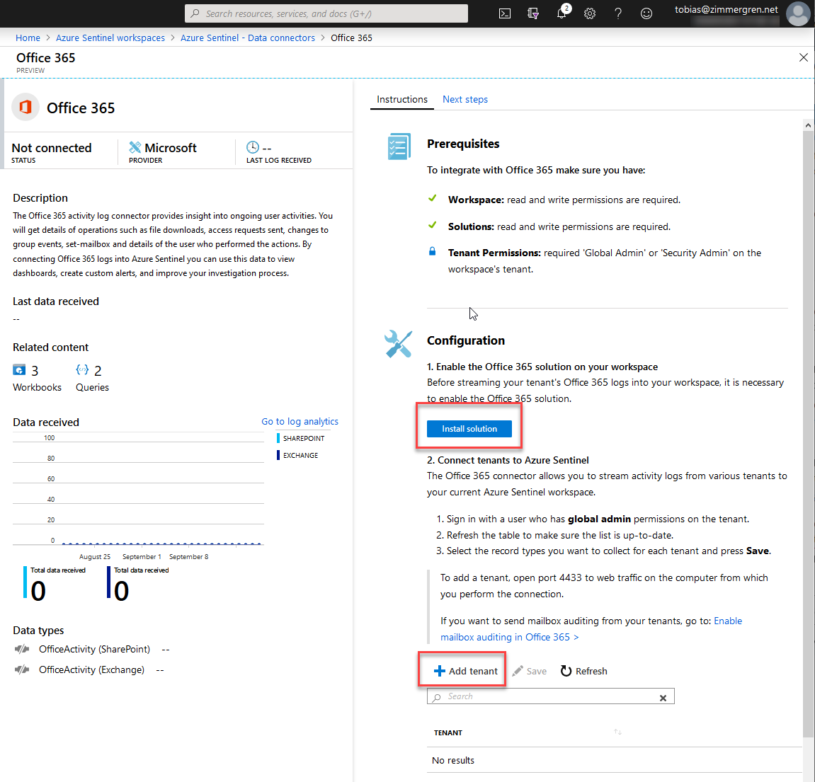 Now that the Azure Sentinel workspace is prepped, and the data connector for Office 365 is installed and enabled, we can add our tenant(s).