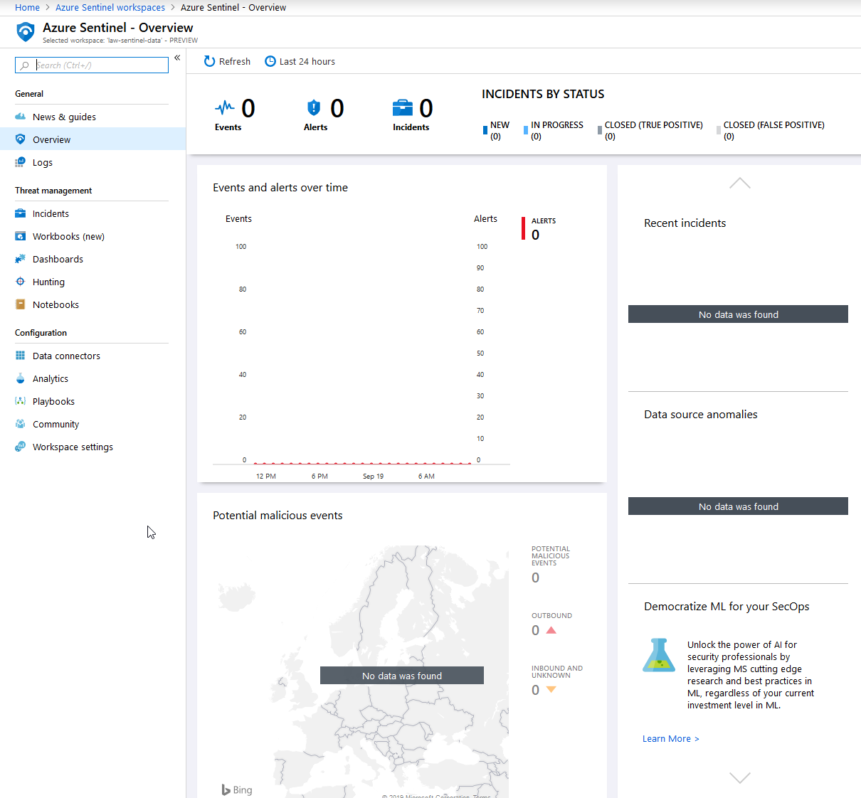 Going back to my Azure Sentinel dashboard, I can see an overview of what’s been happening. Since I just connected and nothing has happened yet, it’s fairly empty. The more data sources you connect and want to ingest here, the more clever insights you’ll benefit from.