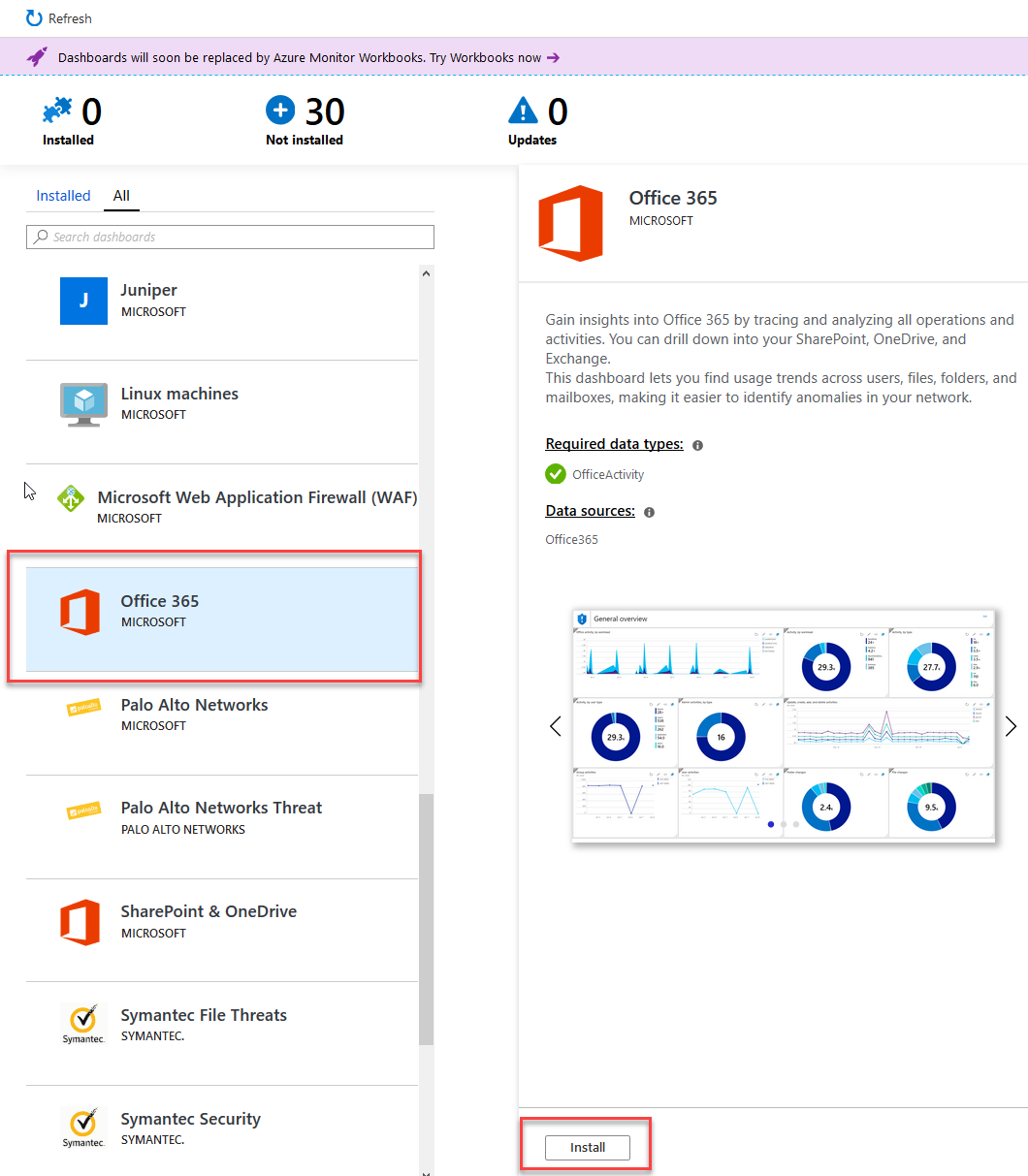 Go to “Dashboards” and find “Office 365”, then click “Install”: