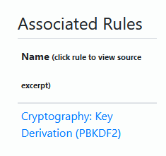 From the summary page you can also drill down into the tags. This is a list of unique tags found that matches one of the rule patterns. I like the ability to navigate this tag list and click items to discover where in my code I’m making use of something - for example cryptographic algorithms.