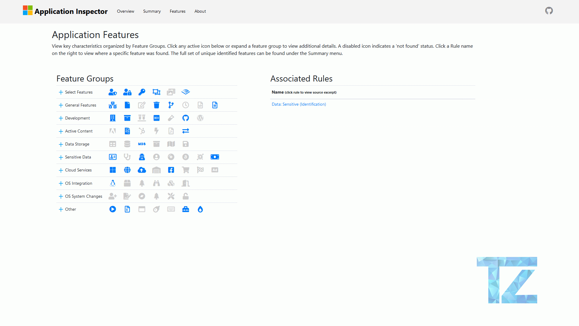 Great, we know that we can drill down into the code by tags that we discovered. Another great feature is the Features view where we can see things light up with visual icons where the code is making use of a particular type of feature.